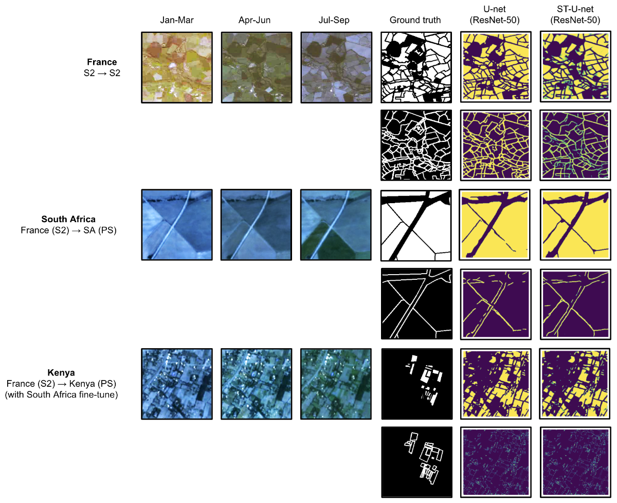Qualitative field boundary segmentation results for example test images in selected experiments. Credit: Kerner, Hannah et al (2024).