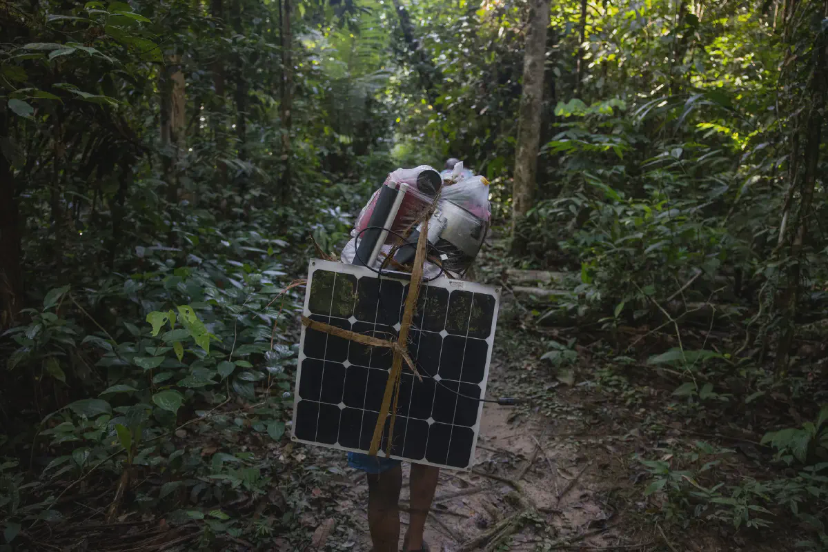 Google Engineers carrying Google Street View cameras into the Grand Canyon. From the Google Maps Blog, 2012. A Marubo person carrying a solar panel in the Amazon rainforest. Photo taken by Victor Moriyama for a New York Times story titled "The Internet's Final Frontier: Remote Amazon Tribes"